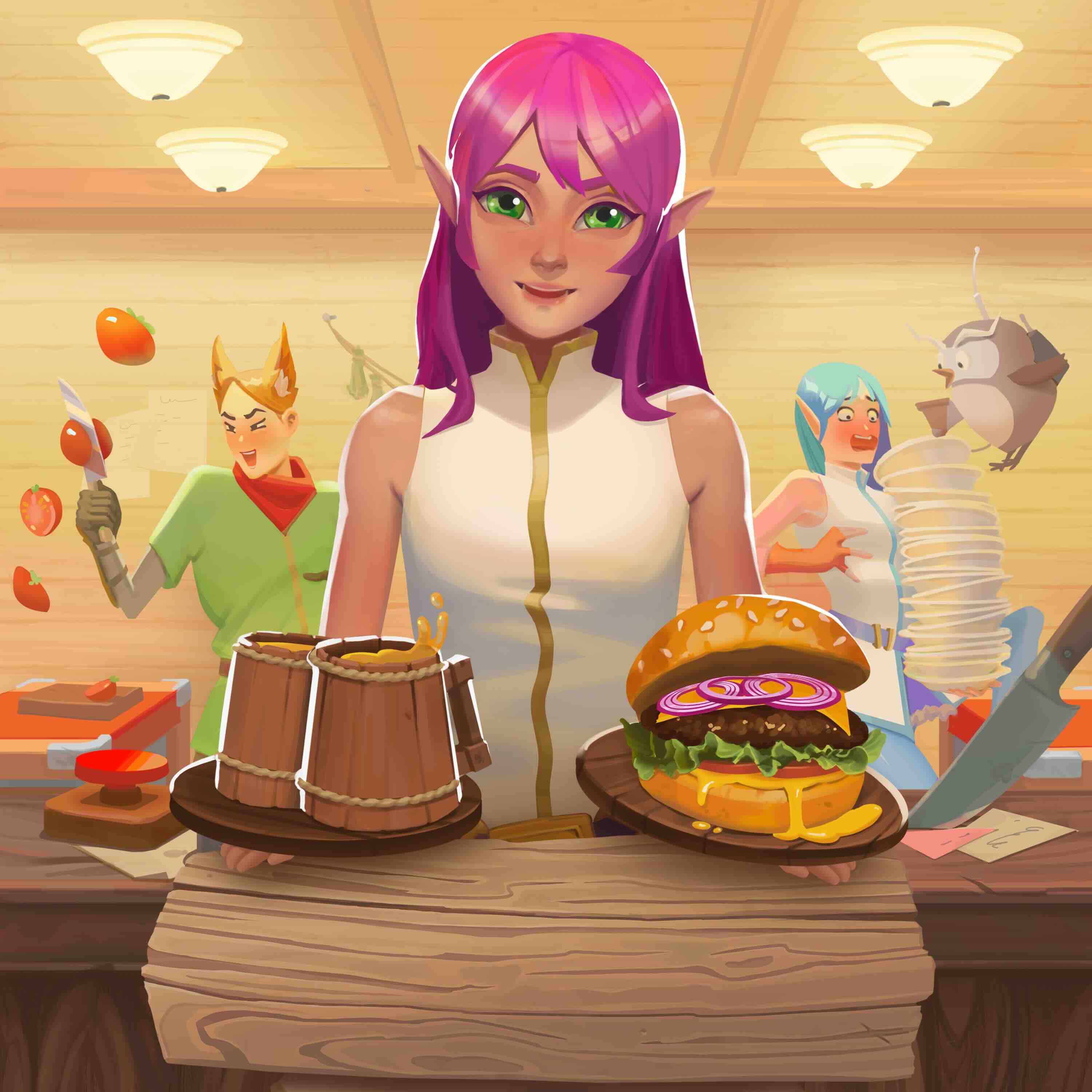Волшебный мир фэнтези ждет, где ты станешь частью команды, спасая репутацию легендарной таверны! Пока хозяин в странствиях, на тебя ложится ответственность обслуживать шумных гостей: эльфов, магов, рыцарей и многих других. Готовь блюда, разливай напитки, не давая посетителям ждать. Каждый успех принесет славу, а неудачи — хаос и разрушение! Успех зависит от командной работы и мастерства в управлении временем. Собери команду, улучшай таверну, разблокируй новые рецепты и превращай заведение в легенду фэнтезийного мира.